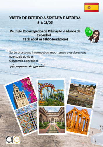 Dia 23 de abril, às 18h30, terá lugar no auditório da Escola Secundária do Castêlo da Maia uma reunião em que serão prestadas informações relativas à visita de estudo a Sevilha e Mérida (de 8 a 11 de maio).