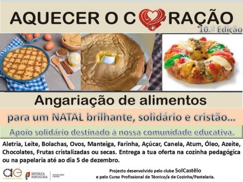 O Clube SOLcastêlo e o Curso Profissional de Técnico/a de Cozinha/Pastelaria vão levar a cabo a 10ª Edição da Campanha Aquecer o Coração dirigida a toda a comunidade do AECM e com o lema: 1 aluno 1 alimento.