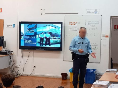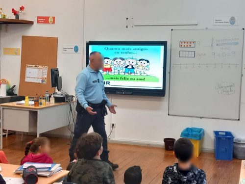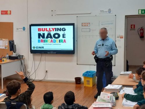 Os agentes começaram por nos explicar o que significa a palavra bullying: empurrar, chamar nomes feios, assustar, pôr a língua de fora… Lembraram-nos que não devemos fazer isso a ninguém — nem aos amigos, nem à família —, porque as pessoas ficam tristes quando são gozadas ou magoadas.